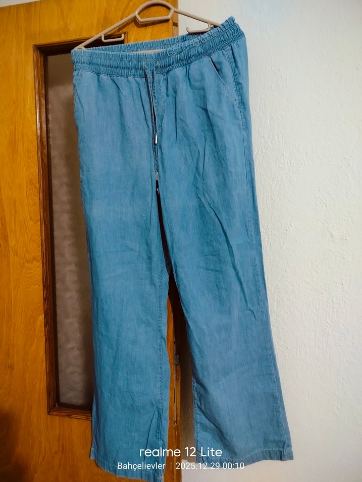 Mavi, bol kesim, kemerli, midi boy kot pantolon. Günlük kullanıma uygun rahat normcore tarzda.