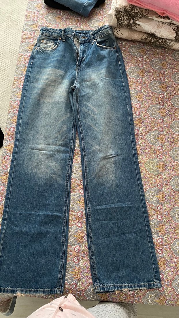 Bol kesim, mavi kot pantolon, midi boyda, pastel tonlarda tie-dye deseni ve tokalı detaylara sahip. Günlük kullanıma uygun, bohem tarzda.
