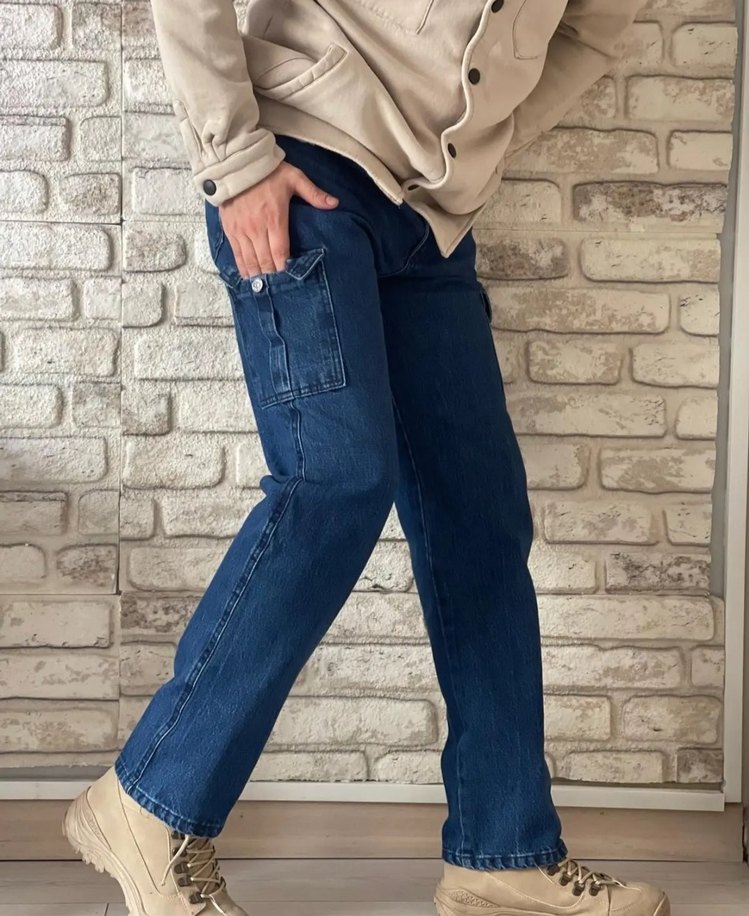 Mavi denim kumaştan, bol kesim ve midi boy kot pantolon. Bel kemerli ve kullanışlı yan cep detayına sahip, günlük rahat kullanım için uygundur.