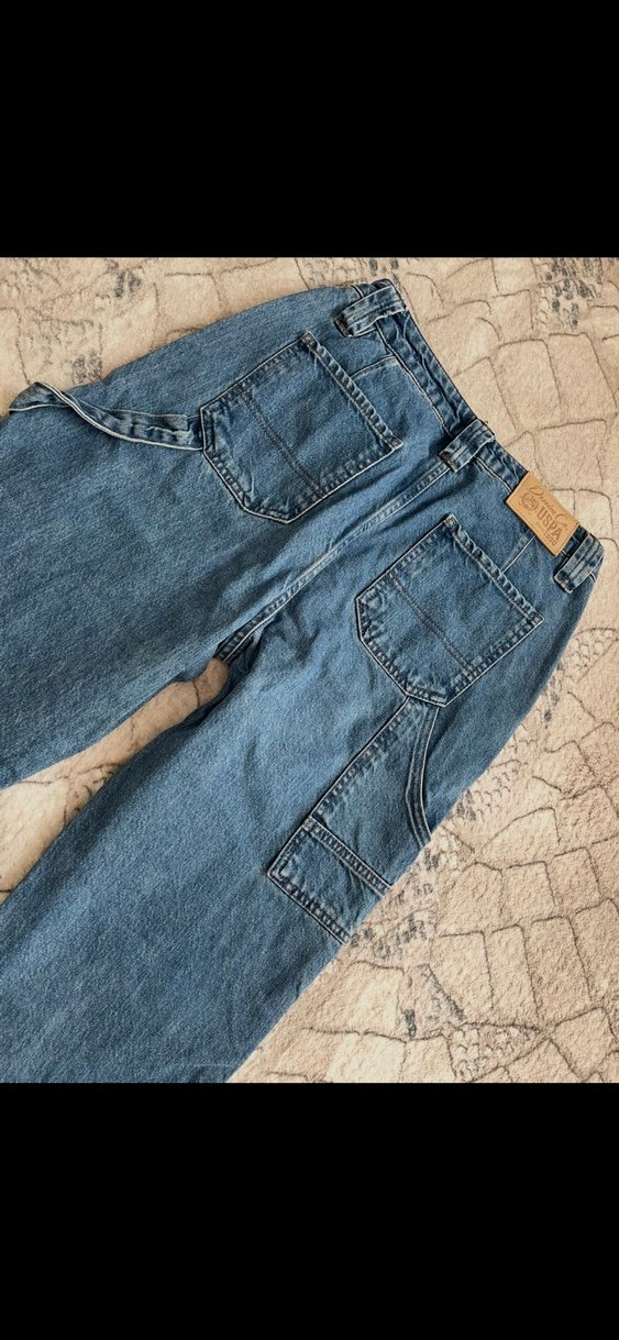 Kadınlar için bel kemerli, bol kesim mavi denim kot pantolon. Normal boyda, sokak stili ve karşı kültür tarzında, günlük kullanım için uygun.