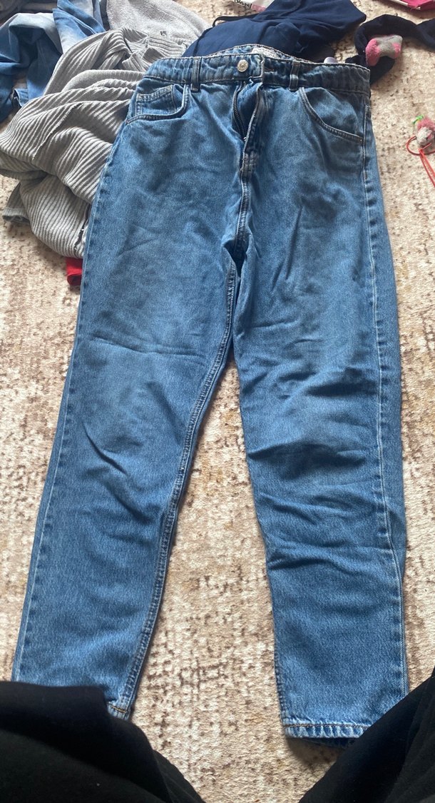 Mavi kot kumaştan, bol kesim ve midi boy kadın pantolon. Kemerli bel detayıyla rahat ve günlük kullanıma uygun.