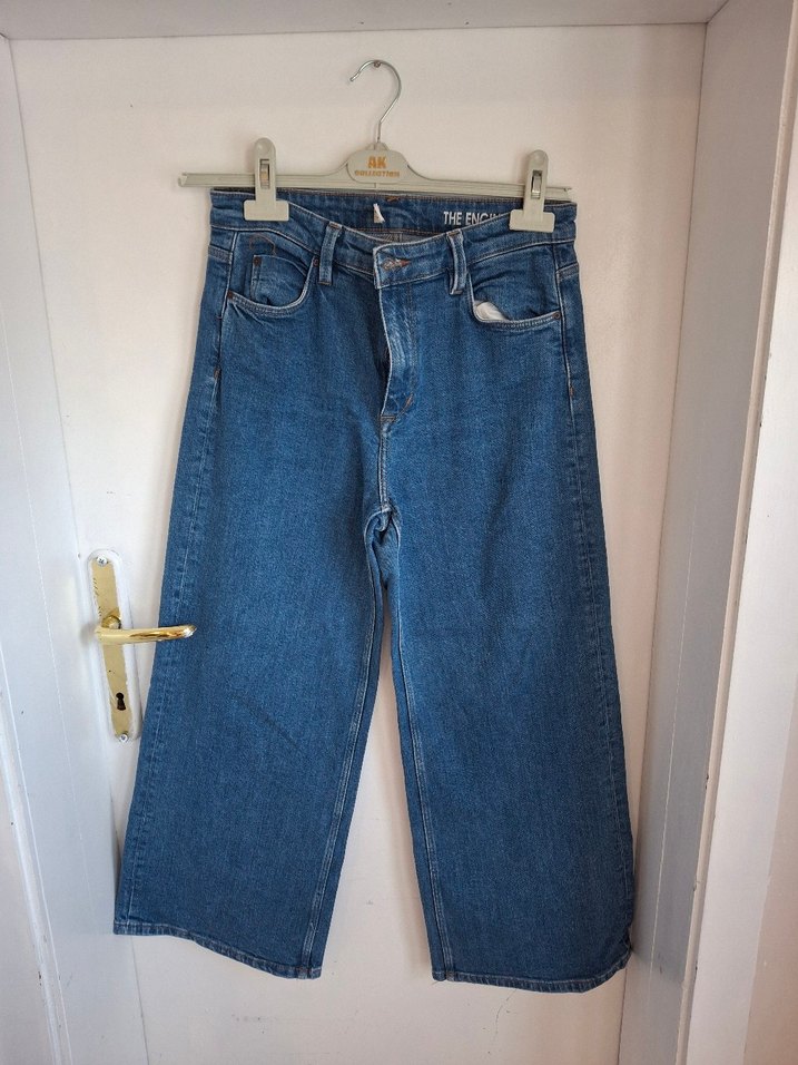 Kadınlar için mavi denim bol kesim midi uzunlukta kot pantolon. Günlük kullanıma uygun, tokalı ve desensiz tasarım.
