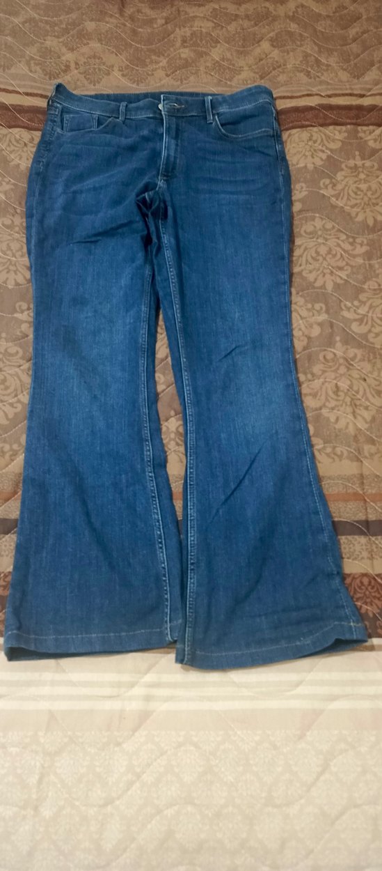 Kadınlar için bol kesim, midi boy ve kemerli kot pantolon. Parlak mavi kumaşı günlük rahat kullanıma uygun bohem tarzda.