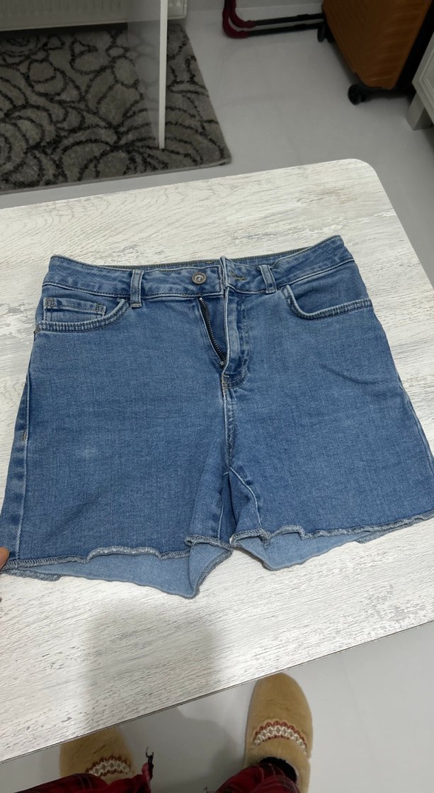 Bol kesim mavi denim mini şort, salaş ve rahat sokak stiliyle günlük kullanıma uygun. Kenarları kesik, zahmetsiz şıklık sağlar.
