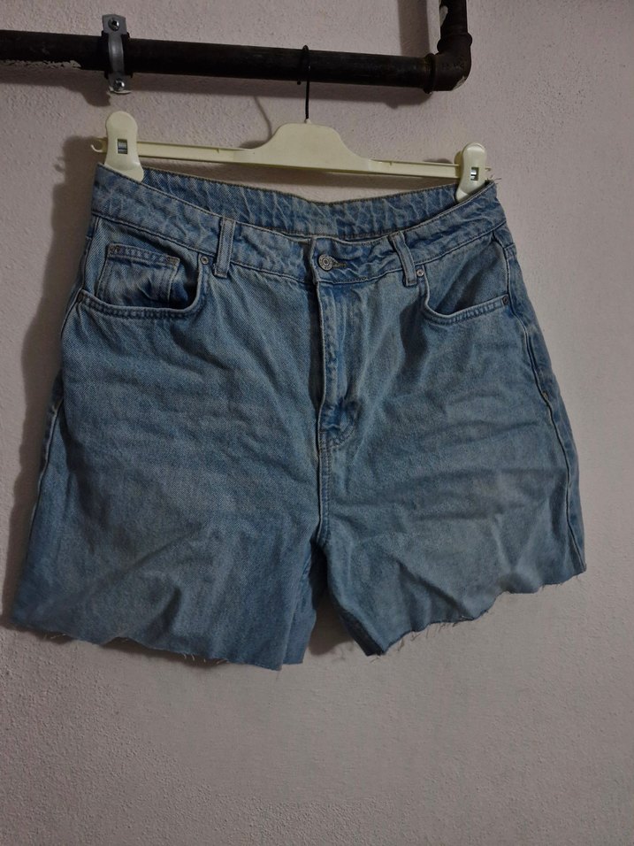 Mavi-gri tonlarda bol kesim mini denim şort, günlük kullanım için rahat ve şık bir sokak stili sunar.