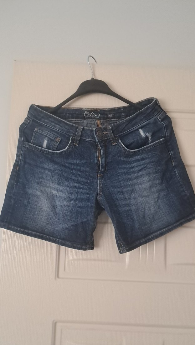 Kadınlar için bol kesim, mini uzunlukta ve tokalı detaylı mavi-gri kot şort. Günlük ve sokak stili için uygundur.