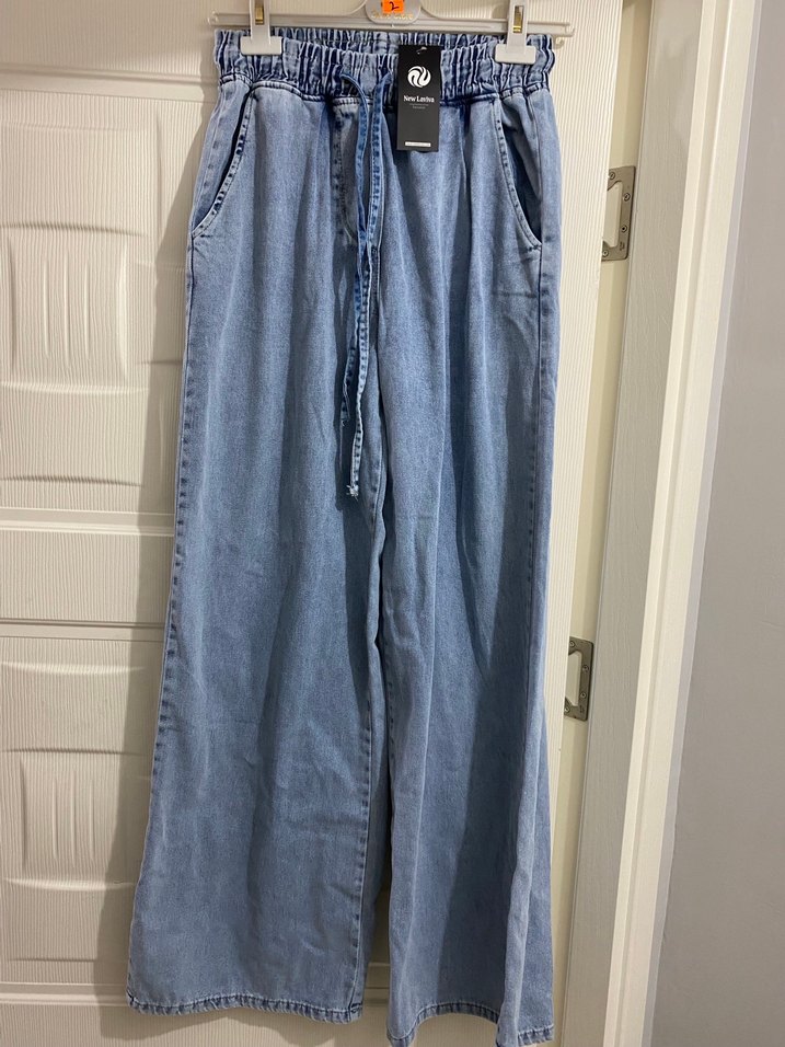 Kadınlar için bol kesim ve uzun boy kot pantolon. Kot kumaştan üretilmiş, kemerli ve sade mavi renkte, günlük ve sokak stiline uygun. Yumuşak cepli beli lastikli