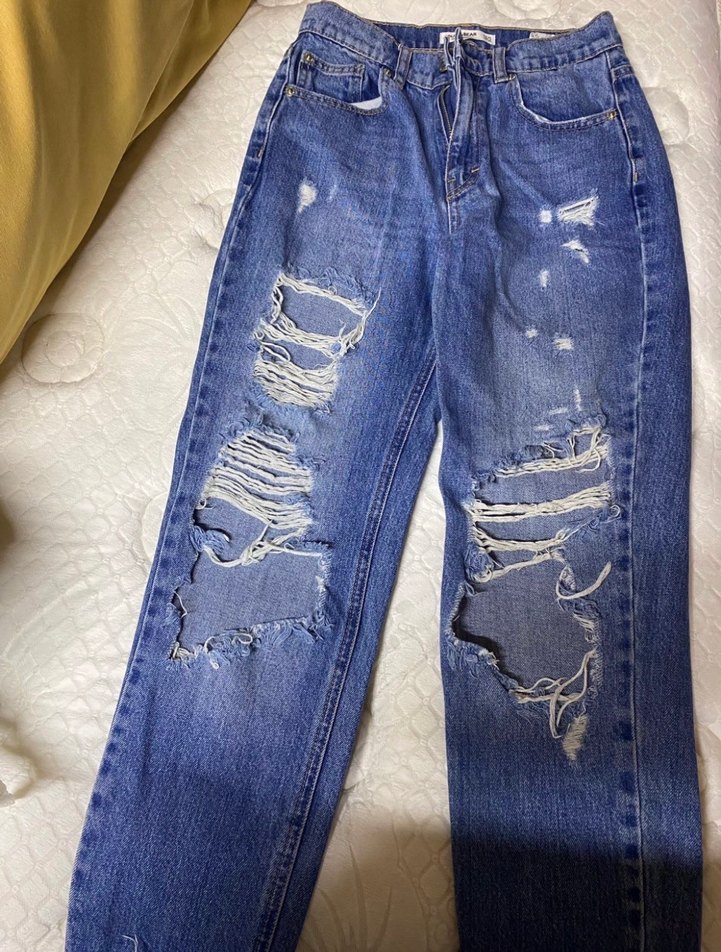 Bol kesim, yırtık detaylı ve tokalı mavi denim pantolon. Günlük rahat kullanıma uygun, midi boy ve parlak renklidir.