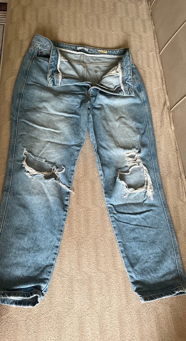 Mavi kot kumaştan, bol kesim, yırtık detaylı, kadın jean. Günlük rahat sokak stili için uygundur.