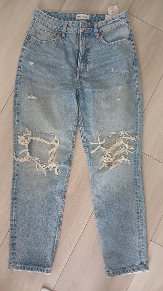 Pastel mavi renkte, bol kesim ve yırtık detaylı kadın kot pantolon. Tokalı beliyle rahat ve günlük kullanım için uygundur.