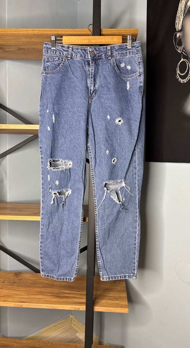 Denim kumaştan yapılmış, tokalı beli ve yırtık detayları olan mavi bol kesim kadın kot pantolon. Normal midi boyda, desen içermeyen, günlük rahat sokak stili için uygun. Mome kalıp
