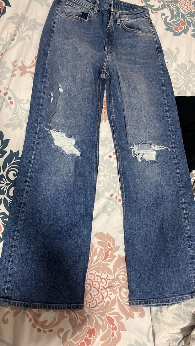 Kadınlar için bol kesim, normal midi boy mavi kot pantolon. Tokalı detay ve yırtıklar ile günlük sokak stili sunar. Gri tonlar içerir.