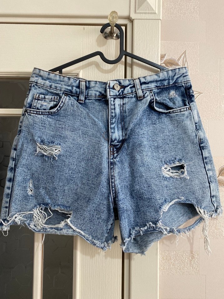 Kadınlar için bol kesim, yırtık detaylı ve tokalı mavi-gri tonlarda kısa mini denim şort. Günlük sokak tarzına uygun.