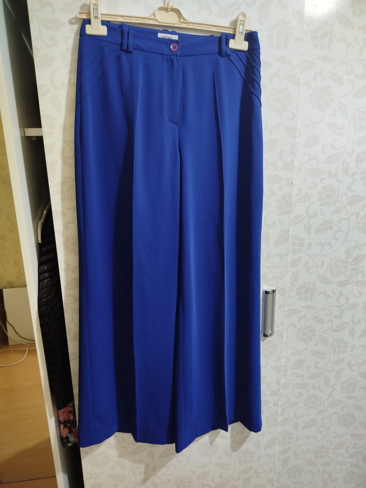 Kadınlar için uzun boy mavi kumaş pantolon, regular fit ve bol detaylara sahip, sentetik kumaştan yapılmıştır. Ofis için modern tarzda.sadece denendi sorunu yok