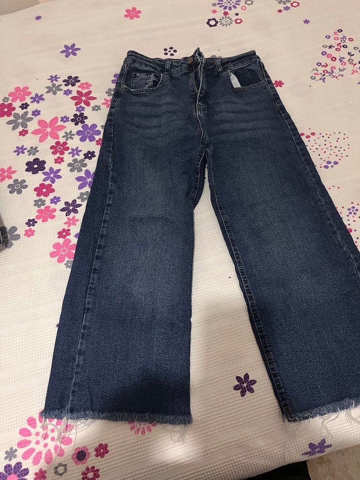 Bu koyu mavi kot pantolonlar, bol kesim, tokalı detay ve midi boy uzunluğa sahiptir. Günlük kullanıma uygun rahat sokak stili sunar.
