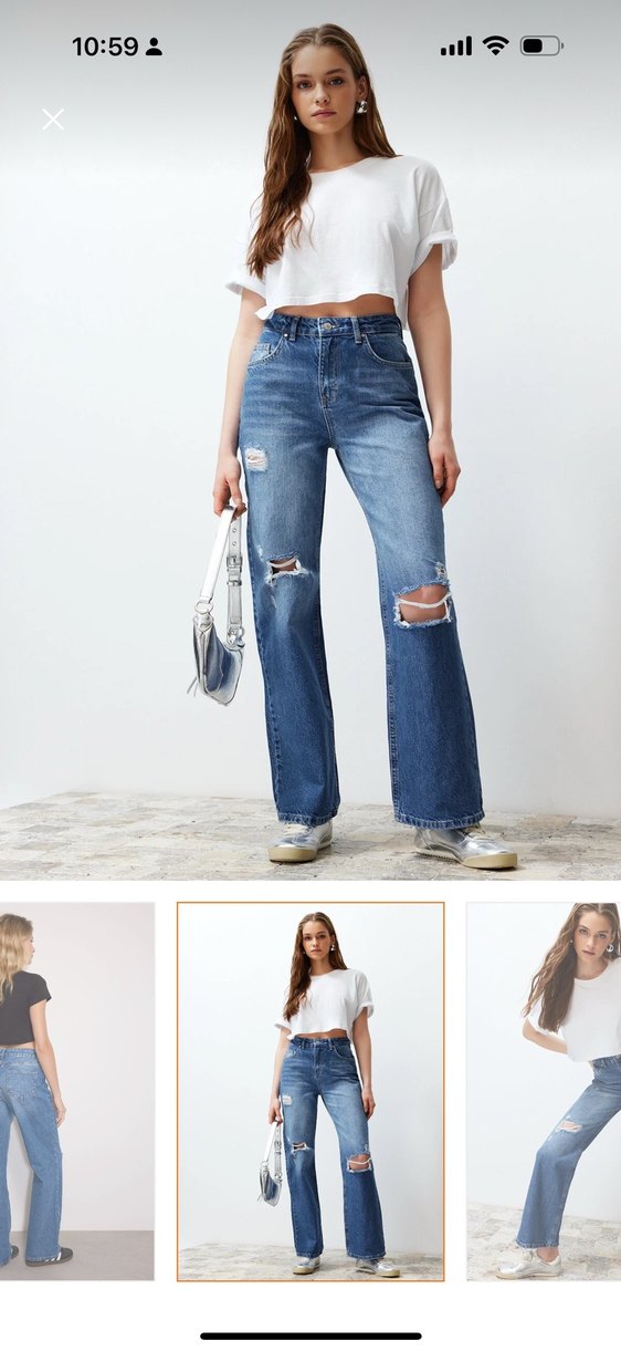 Kadın Mavi Bol Paça Yırtık Denim Jean
