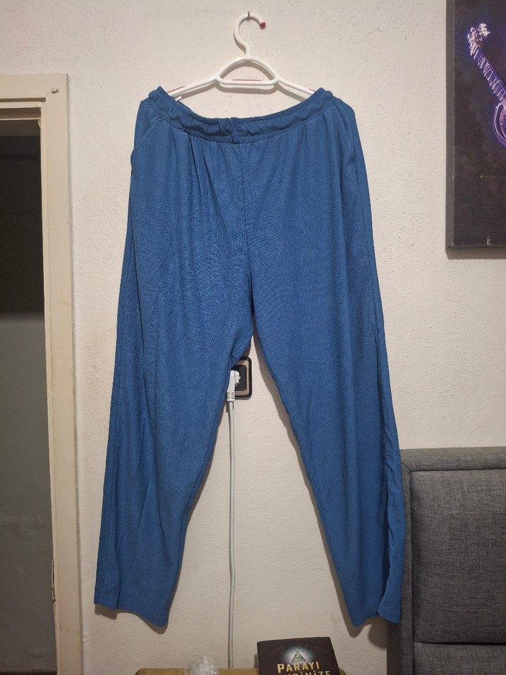 Mavi Bürümcük salaş kesim ve günlük rahat kullanım için uygun, sokak stili esintili kadın pantolonu.