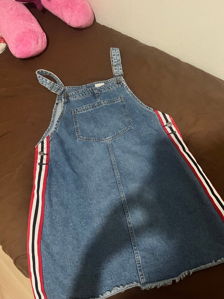 Kadınlar için çizgili yan detaylı, askılı ve tokalı mavi denim kısa tulum. Ön cep ve normal boy, günlük rahat kullanıma uygun.