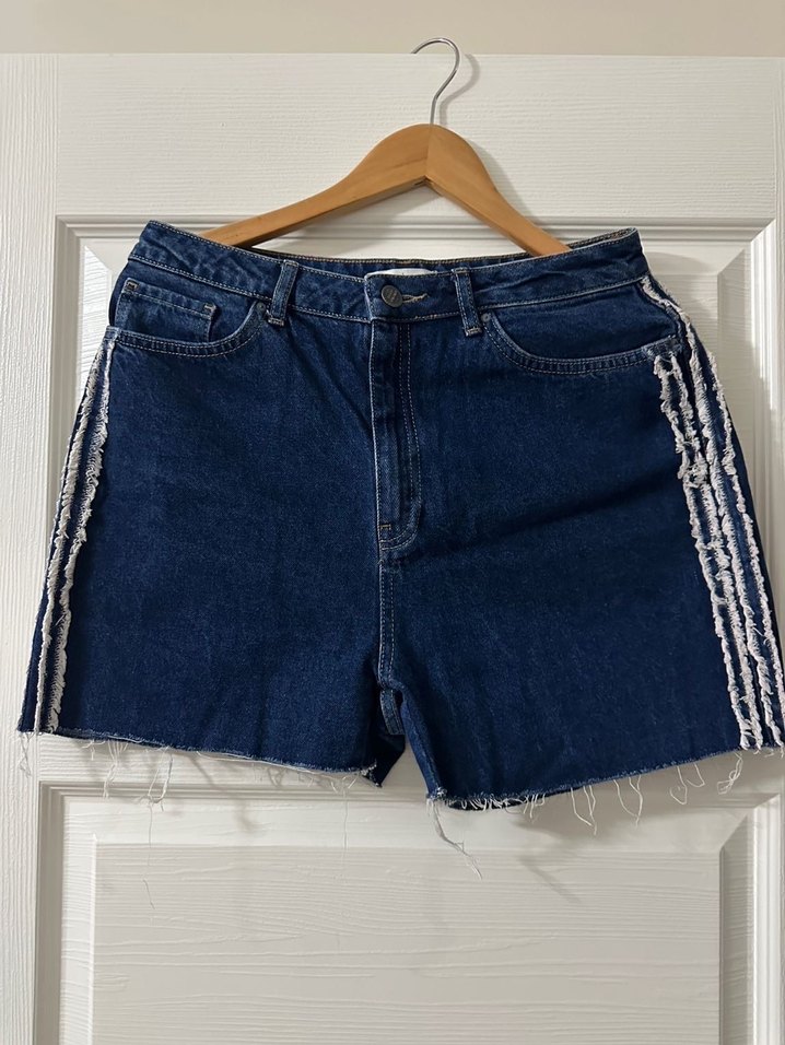 Mavi kot şort, bol kesim ve kemerli bel, yanlarda parlak çizgili detaylarla günlük şıklık sağlar.