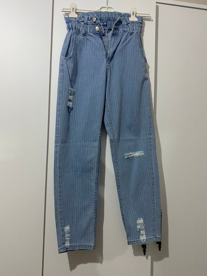 Mavi çizgili, kemerli, mom jean. 26 beden ürün temiz etiketsiz hiç giyilmedi
