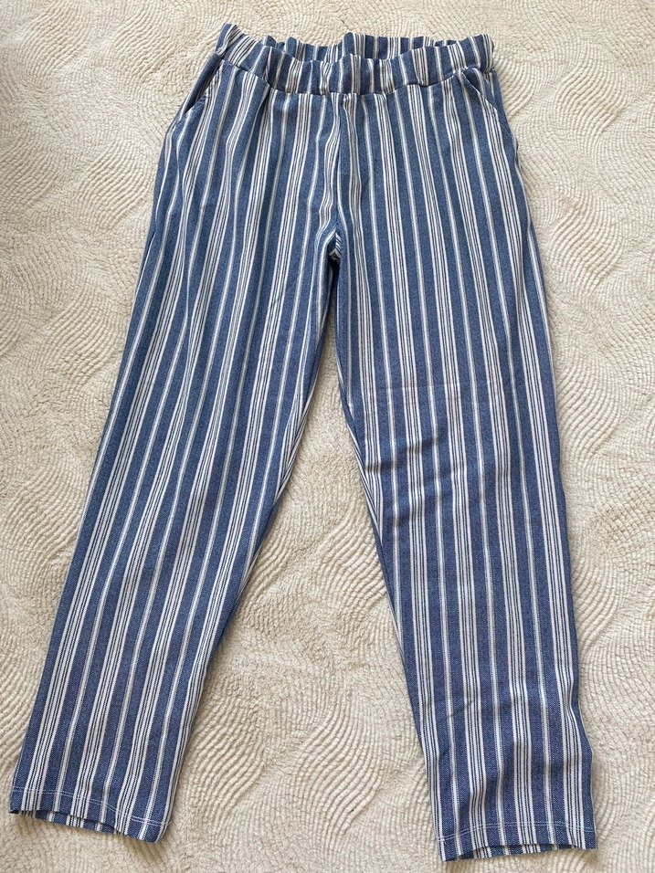 Kadınlar için mavi çizgili, pilili, bol kesim midi boy denim pantolon. Rahat lastikli bel detayıyla günlük sokak stiline uygun.