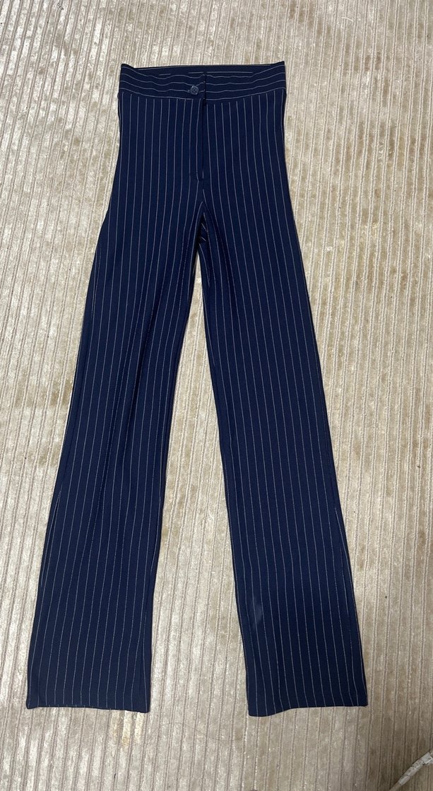 Mavi çizgili kot pantolon, pilili detaylı ve regular fit. Uzun boy, ofis için uygun, şık ve rahat günlük stil için ideal.