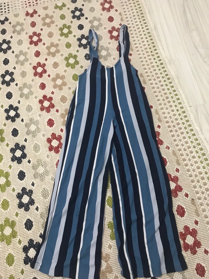 Kadınlar için mavi çizgili, bol kesim ve pile detaylı uzun tulum. Askılı ve bohem tarzda, günlük kullanıma uygundur.