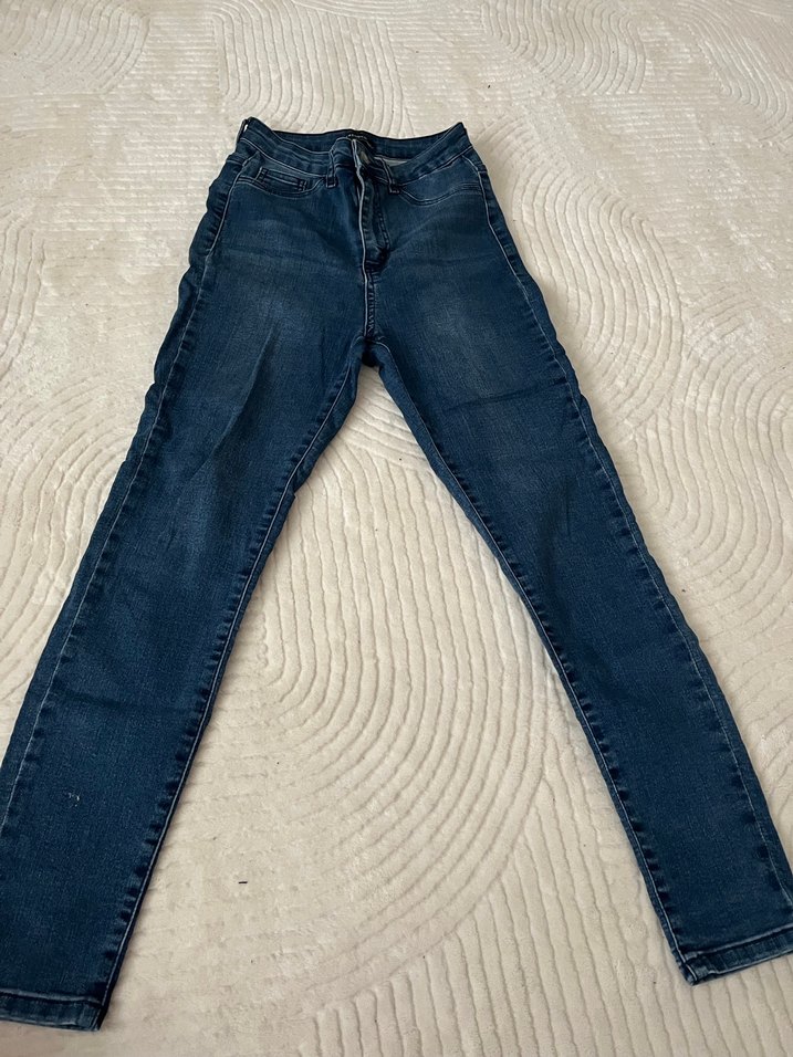 Kadınlar için mavi denimden dar kesim, midi boy kot pantolon. Günlük kullanım için rahat ve şık bir tarz sunar.