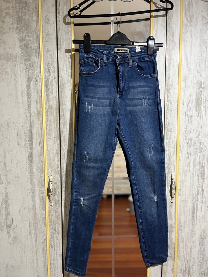 Mavi, dar kesim midi kot pantolon, tokalı bel detayıyla günlük kullanıma uygun. Desensiz, hafif yıpranmış görünümlü kot pantolon.