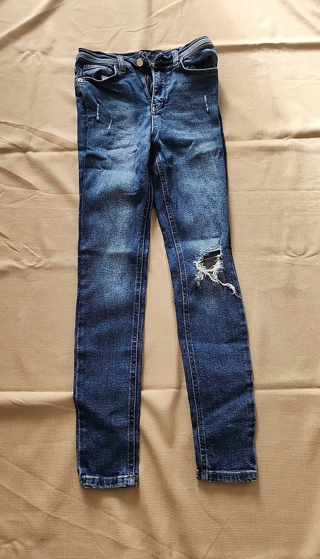Dar kesim, mavi denim kot pantolon, kemer tokası detaylı ve yırtık diz bölgesiyle günlük rahat kullanıma uygun. Midi boy, sokak stili.