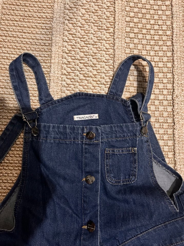 Koyu mavi denim kumaştan, askılı ve tokalı kadın kısa tulum. Ön düğmeli ve dar kesim, günlük sokak stiline uygun. Üzerinde 'EMAGAZINE' etiketi bulunur.