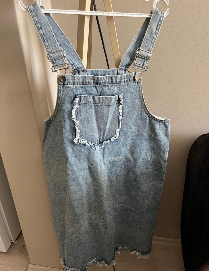 Mavi denim kumaştan, askılı ve tokalı, önü yıpranmış cep detaylı, rahat kesim midi boy kadın salopet. Günlük kullanım için uygundur.