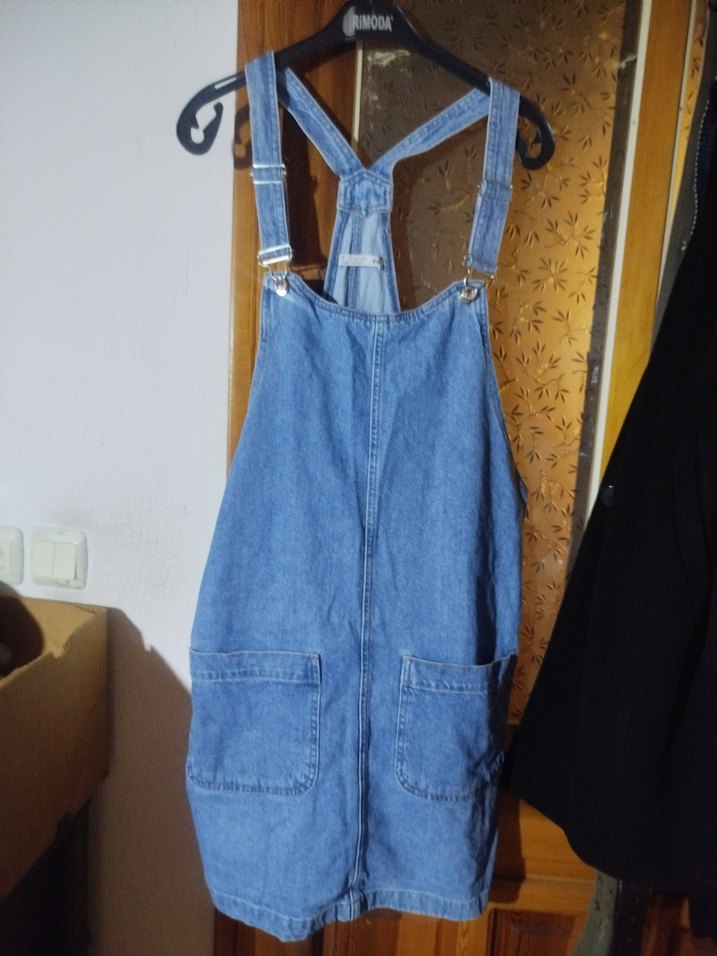Mavi denim midi uzunlukta, askılı ve tokalı kadın salopet. Rahat kesim ve büyük ön cepler ile günlük kullanıma uygun.