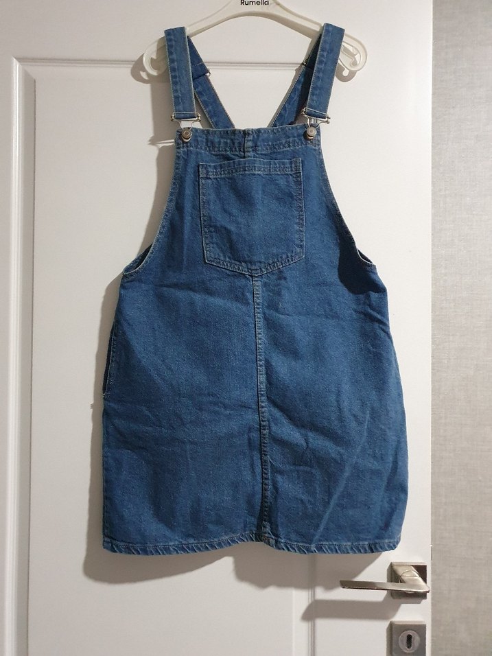 Mavi denim kumaştan, askılı ve cep detaylı, bol kesim kadın midi tulum. Günlük rahat kullanım için uygundur. Boy 70cm en46cm. yanlardan cepki