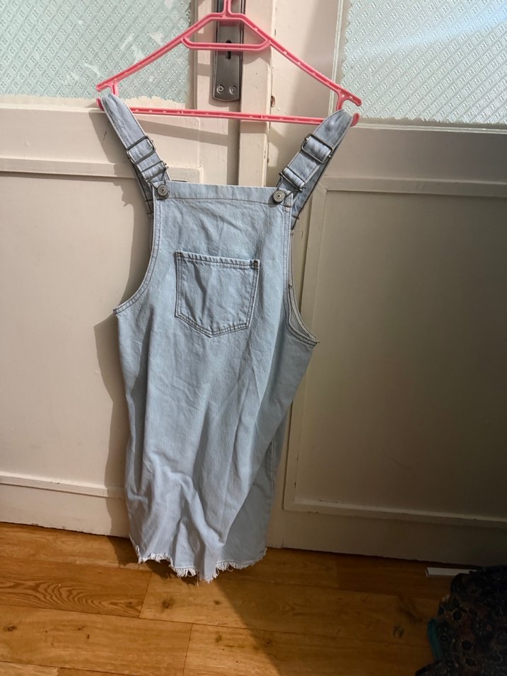 Mavi denim kumaştan, tokalı askılı ve ön cepli, halter yaka stilde, günlük kullanıma uygun bohem tarzda dar kesim tulum.