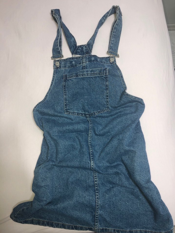 Ayarlanabilir tokalı askılara ve ön cepe sahip, bol kesim mavi denim midi tulum, günlük rahat kullanım için uygundur.