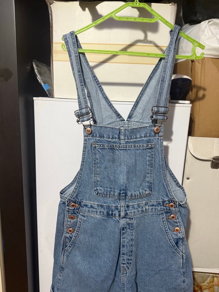 Ayarlanabilir tokalı askıları ve oturan kesimi ile mavi denim kısa salopet, günlük rahat sokak stili için uygundur.