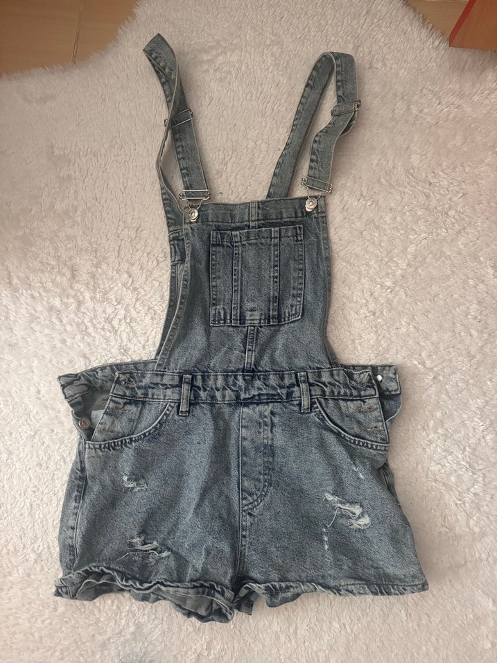 Ayarlanabilir tokalı askılı, bağlama desenli mavi denim, bol kesim kısa şort tulum. Günlük ve sokak stiline uygun.