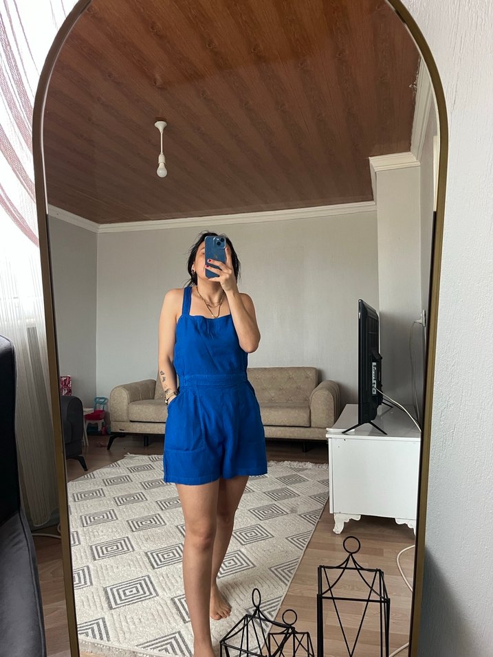 Koyu mavi denim, askısız ve bol kesim şort tulum, minimal ve normcore tarzıyla günlük rahat kullanım için uygun.