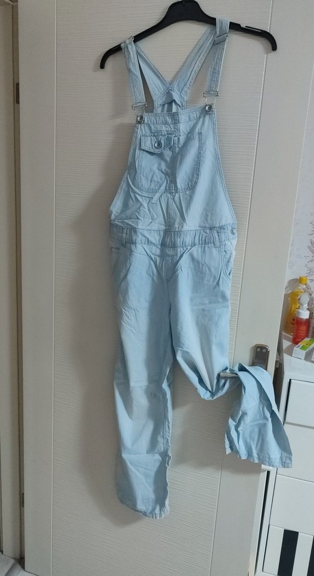Açık mavi denim askılı tulum, halter yaka ve tokalı askılarla. Rahat kesim ve midi boy, günlük kullanıma uygun.