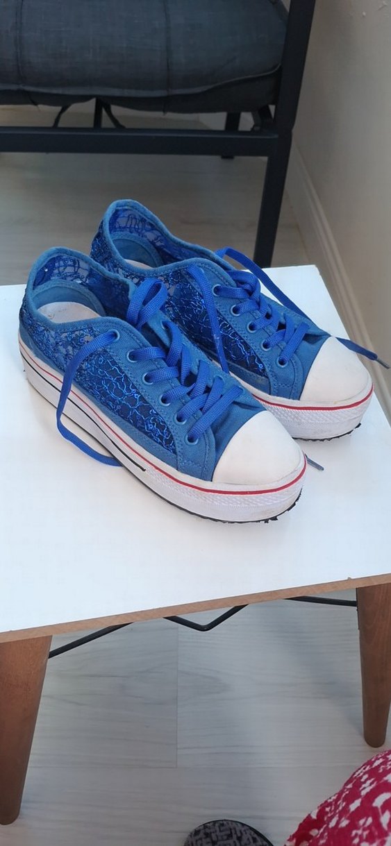 Bağcıklı detaylı, platform tabanlı mavi denim kadın spor ayakkabısı, renkli batik desenli, sportif tarz için uygun. sıfır ürün
