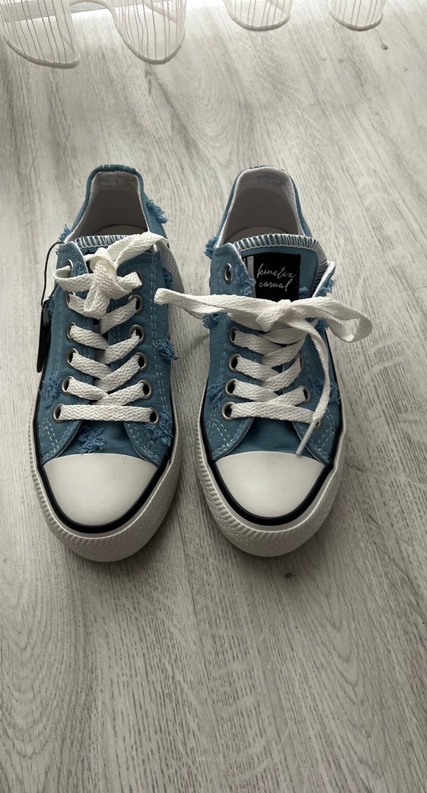 Pastel tonlarda bağcıklı, mavi denim kumaştan yapılmış kadın spor ayakkabısı. Stiletto topuklu, günlük kullanıma uygun şık bir model.