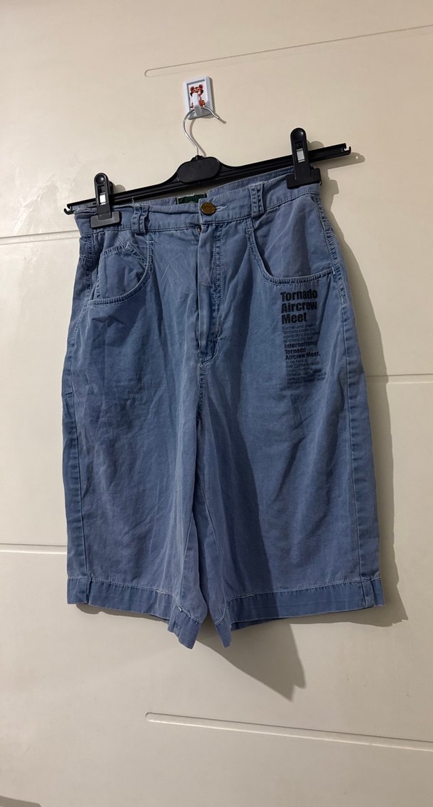 Ön cepli, baskılı detaylı, bol kesim mavi denim Bermuda şort, günlük rahat kullanım için uygundur.