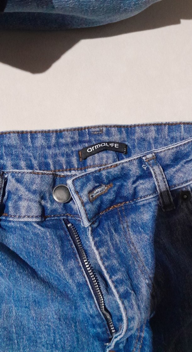 Bol kesim mavi denim kadın jean, fermuarlı ve gri batik desenli, günlük kullanıma uygun sokak stili görünümü sunar.