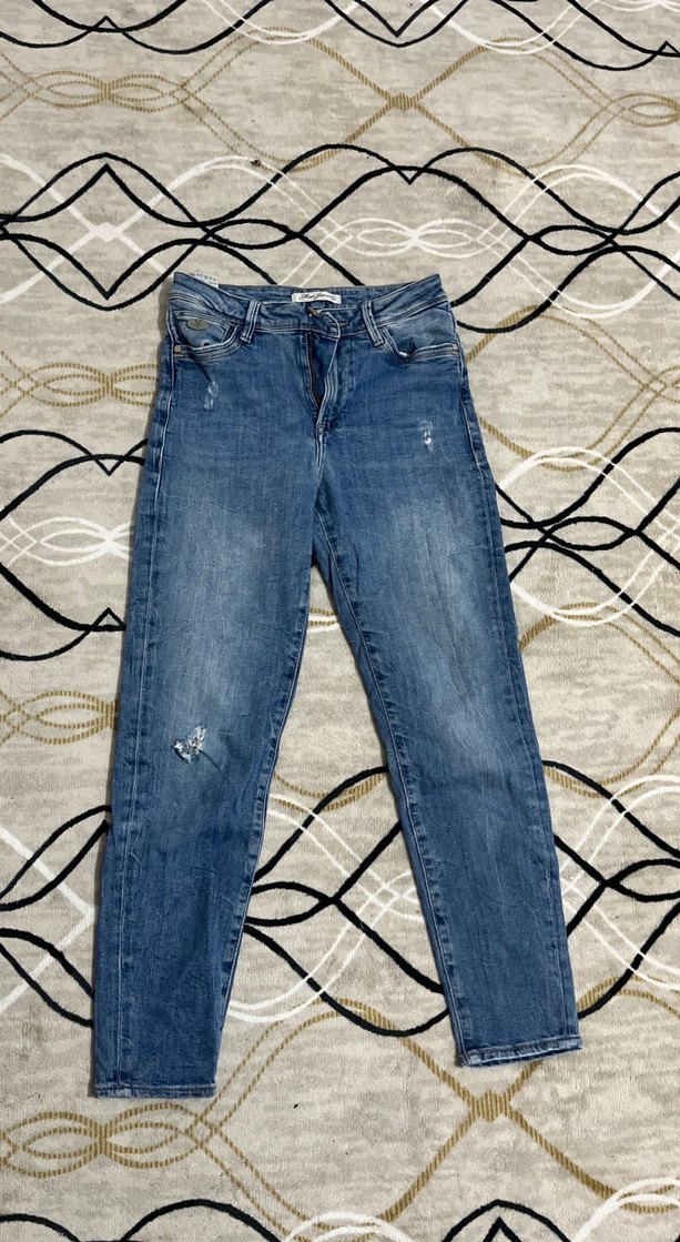 Bağcıklı detaylı, bol kesim mavi denim kot pantolon. Normal boyda, günlük rahat kullanım için uygundur. ️