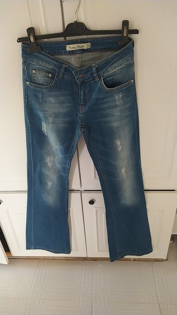 Kadınlar için parlak mavi denimden, bol kesim ve tokalı detaylı jean. Midi boyda, günlük kullanım için uygun, rahat sokak stili pantolon. 27 beden bel 37 boy 105