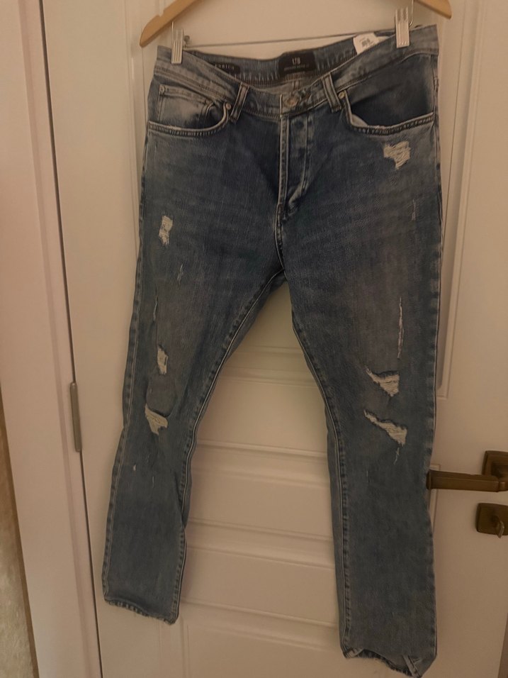 Mavi denim dar kesim, normal boy kot pantolon, tokalı detaylı ve yıpranmış görünümlü. Günlük sokak stiline uygun.