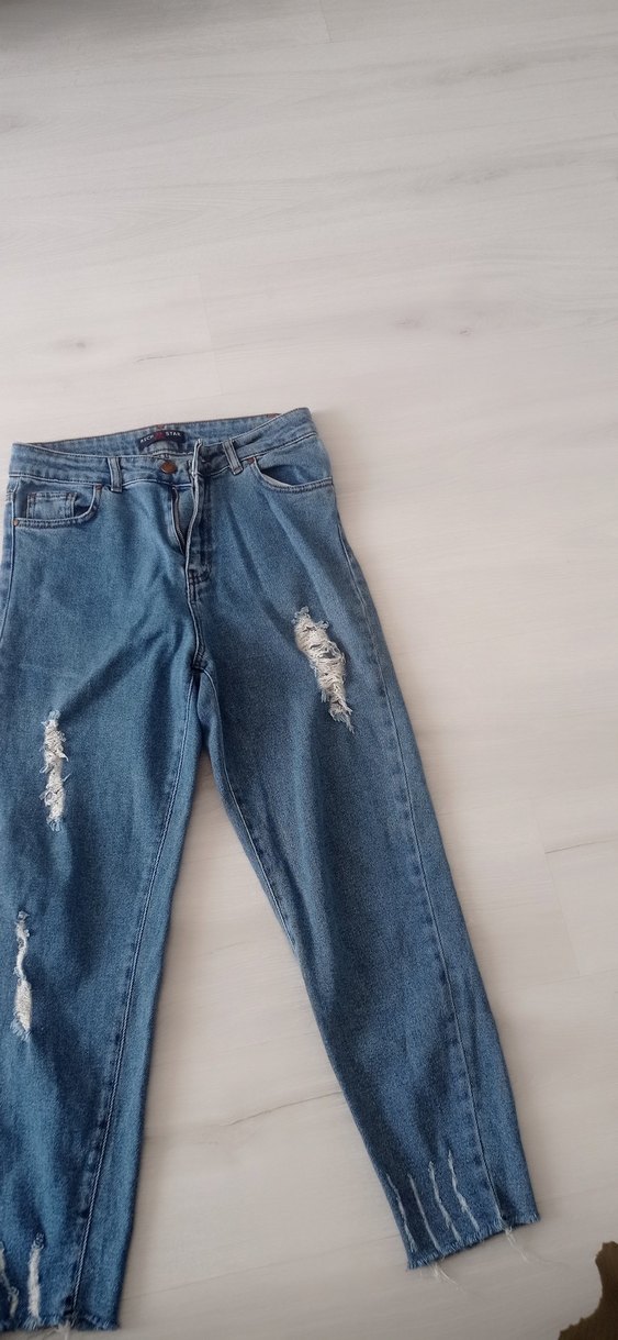 Kadınlar için bol kesim, mavi denim kot pantolon. Tokalı bel, midi boy ve yırtık detaylı, günlük rahat ve sokak stili için uygun.
