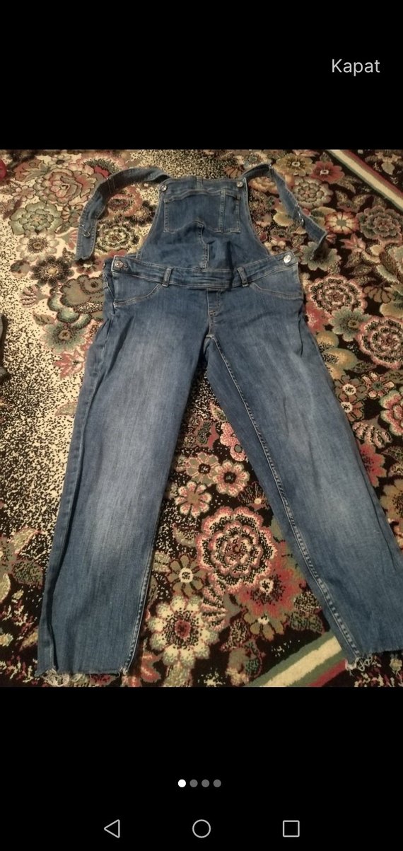 Bol kesim mavi denim uzun tulum, tokalı askılar ve günlük kullanıma uygun rahat sokak stili ile.