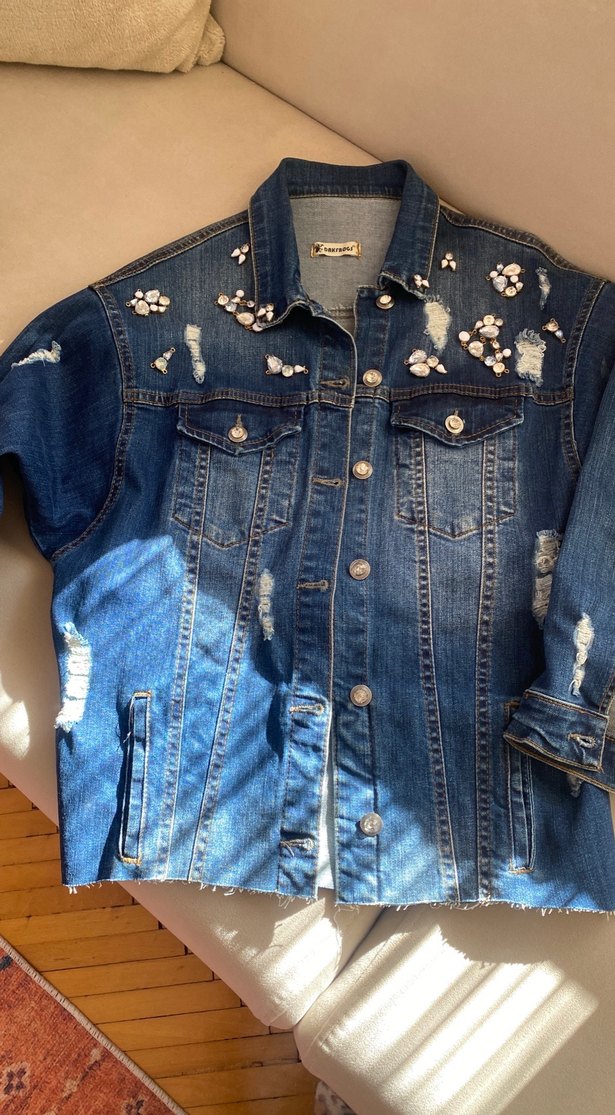 Mavi renkte, düğmeli ve taş detaylı bol kesim kot ceket. Uzun kollu ve midi boy, günlük rahat stil için uygun.